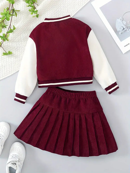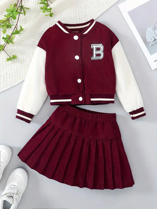 MegastoreNo reviewsOut of stockThis outfit set features a color-block varsity jacket with a bold letter "B" print and a matching pleated skirt, perfect for cooler months. Ideal f...