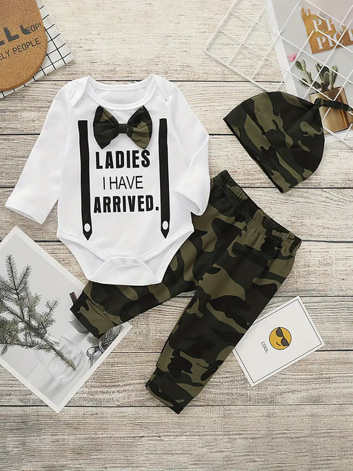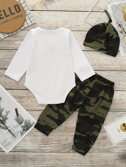 MegastoreNo reviewsOut of stock3-piece outfit with letter print romper, camo pants, and matching hat. Stylish and comfy for autumn adventures. Size: 3-6 Months Bust size: 50cm / ...