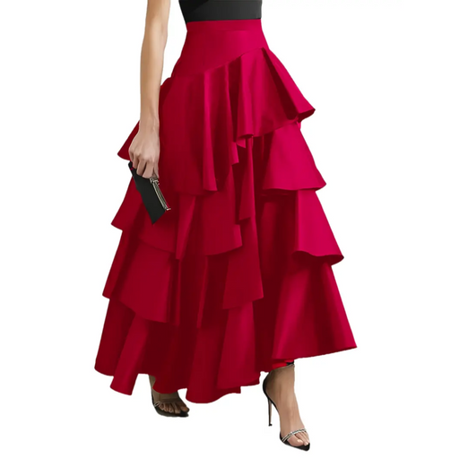 MegastoreNo reviewsOut of stockElegant high-waist skirt designed for fall and winter. Made from 100% polyester, this long-length skirt features an asymmetrical hem and tiered ruf...