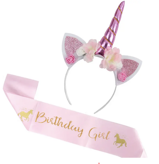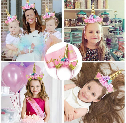 MegastoreOut of stockUnicorn Headband with Sash Paper Party decoration for unicorn theme birthday girl, pink, gold glitter satin sash