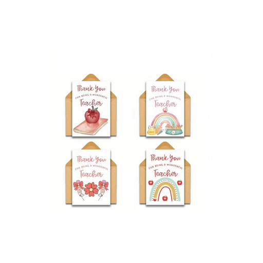 MegastoreNo reviewsIn stock4-Pack Teacher Thank You Cards with Envelopes – Adorable Classroom Appreciation Designs Featuring Hearts, Rainbows, Apples, Flowers & School Th...